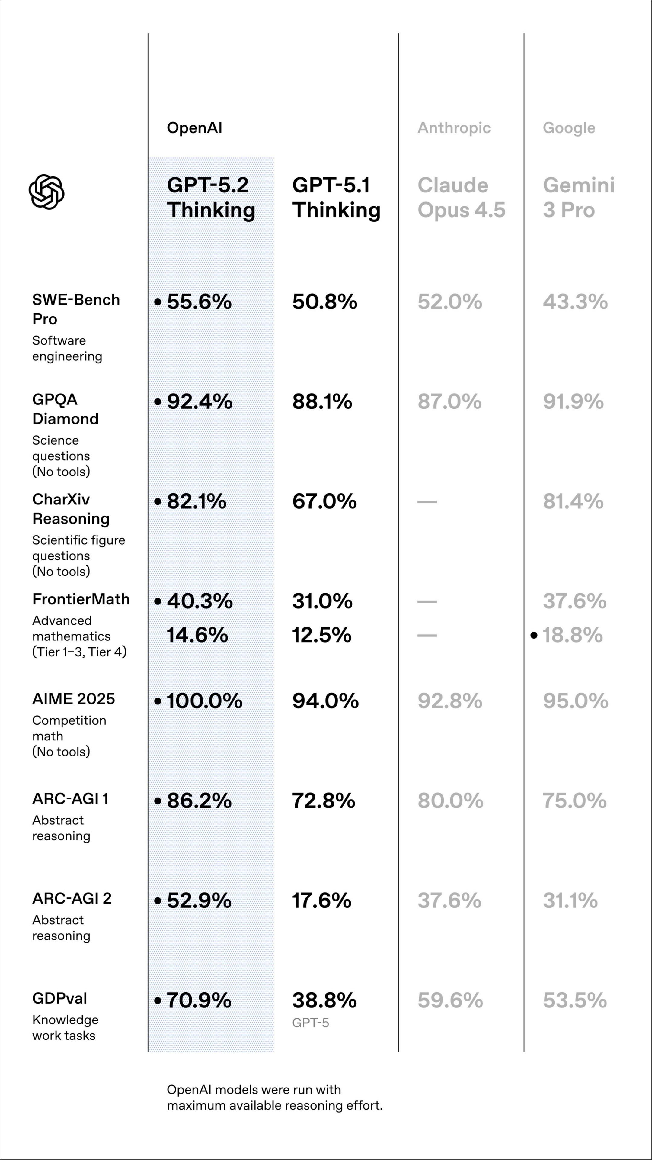 其中,GPT-5.2在博士级别的专家推理评估GPQA Diamond得分高达92.4%,相比GPT-5.1 Thinking的88.1%和Gemini 3 PRO刚刚刷出的91.9%高分再进一步。在不用工具的情况下,GPT-5.2在最新美国数学邀请赛(AIME2025)中拿到了满分。